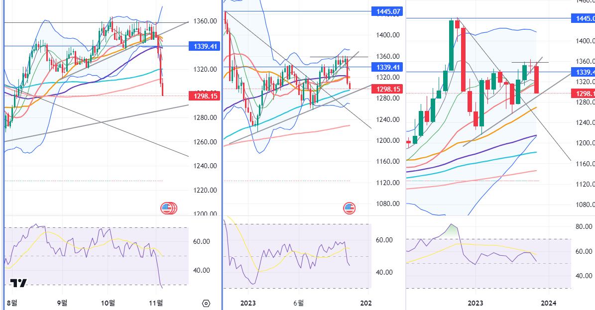 => 다음 지지선은 주봉 100일, 주봉 상승추세선 라인( 1280 중후반) -> 일봉 RSI도 과매도 구간이라 1280 때 롱진입 계획