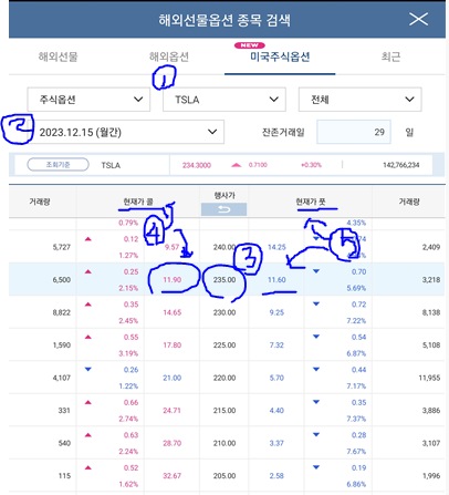 ④는 "콜옵션"의 가격으로서, "2023년 12월 15일"에 테슬라를 "235.0$"에 (100주)살 권리가 "11.90$"에 매매되고 있다는 뜻입니다. (보통 날짜가 많이 남았을 수록 권리 가격이 높게 형성됩니다.)
