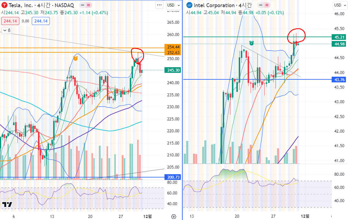- 인텔은 오늘 월봉 마감이라 이대로 볼벤 상단 돌파 못하며 추가 조정 가능할지도