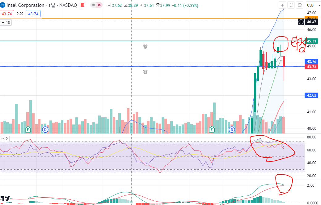 - MACD 교차 분위기/ RSI,MFI 하락 다이버전스/ 강한 저항선