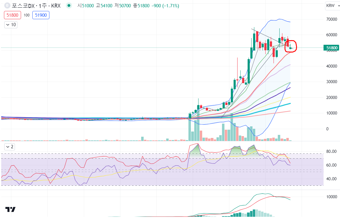 - 주봉상 MACD 교차 시작(하락추세) + RSI, MFI 하락 다이버전스