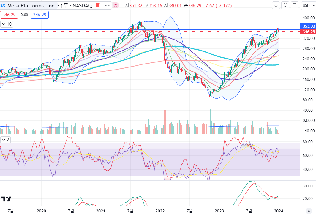 (마소, 애플, 구글은 생성형AI, 온디바이스 AI, 테슬라는 자율주행, 로봇 , 등 든든한 미래먹거리가 보이는데 반해 메타는 타겟 광고AI 이외 다른 AI 기술을 보유한 것으로 보이지 않고, 메타버스(AR/VR) 쪽에 엄청난 투자를 하였고 이 분야 기술력을 인정되나 가시적인 성과가 없었음.. 실제로 이부분은 엄청난 적자.. 페북, 인스타 통한 광고매출이 98%인데, 이것도 경기 둔화되면 어렵지 않을까? )