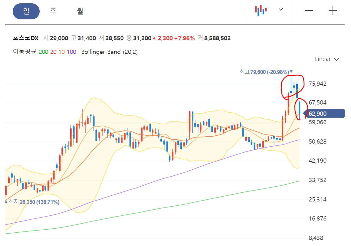 - 다행히도 이번주와서 나스닥->코스피 박살 + 코스피 이전상장됨과 동시에 차익실현 물량(?) 나와주면서 거래량 동반한 큰 하락세가 나옴