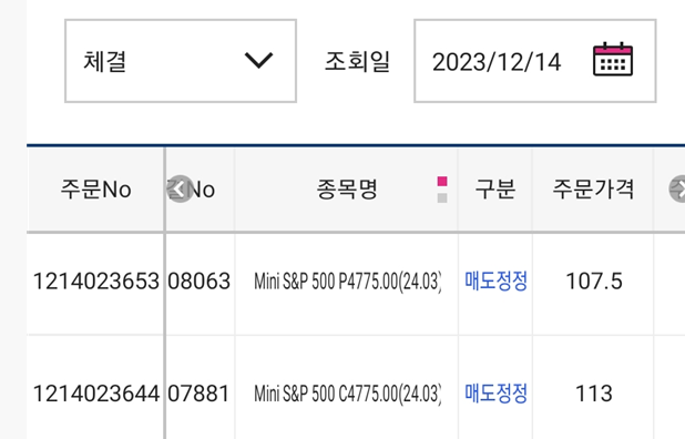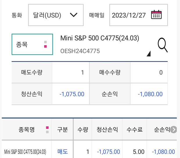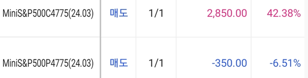 - S&P 3월물 4775 콜옵션과 풋옵션을 1개씩 매도하여 진입함 (증거금 하나당 $13000씩)