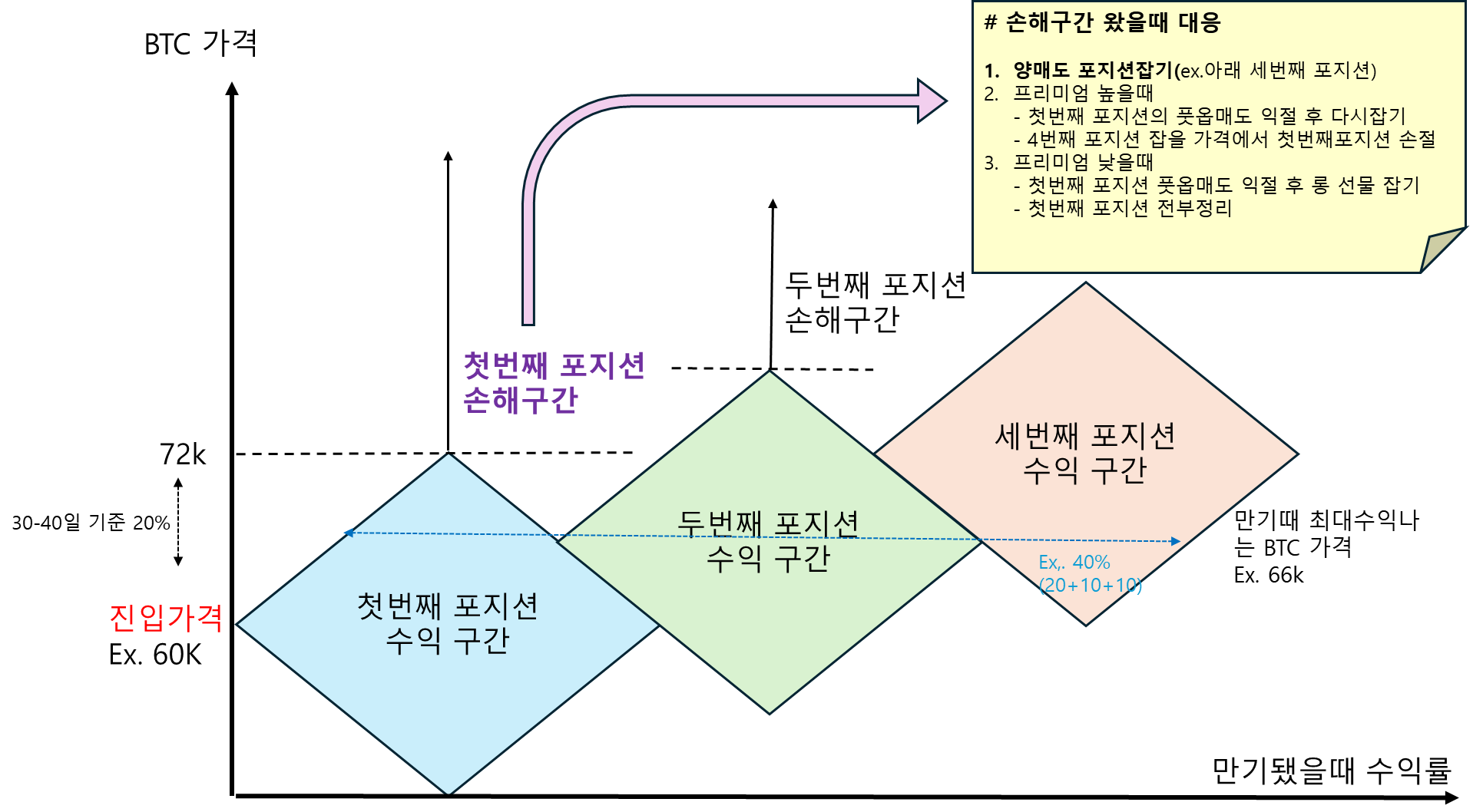 - 60k에 진입 후 66k쯤 오면(콜옵프리미엄으로 커버할수 있는 범위) 두번째 포지션 잡기