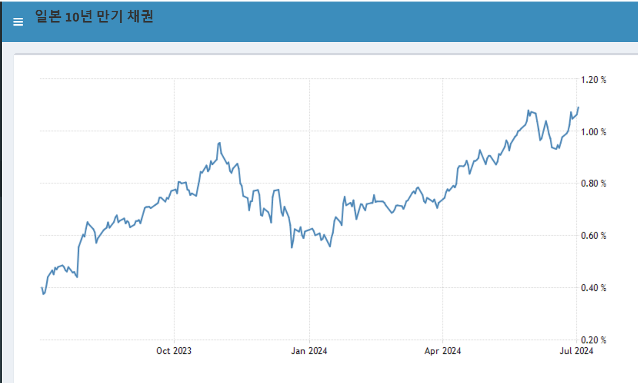 1. 미국과의 금리차로 인한 엔화 약세가 아주 심한 상황(37년만에 가장 고점) -> 미국이 금리를 내리려고 함 -> 상대적으로 엔화 상승가능