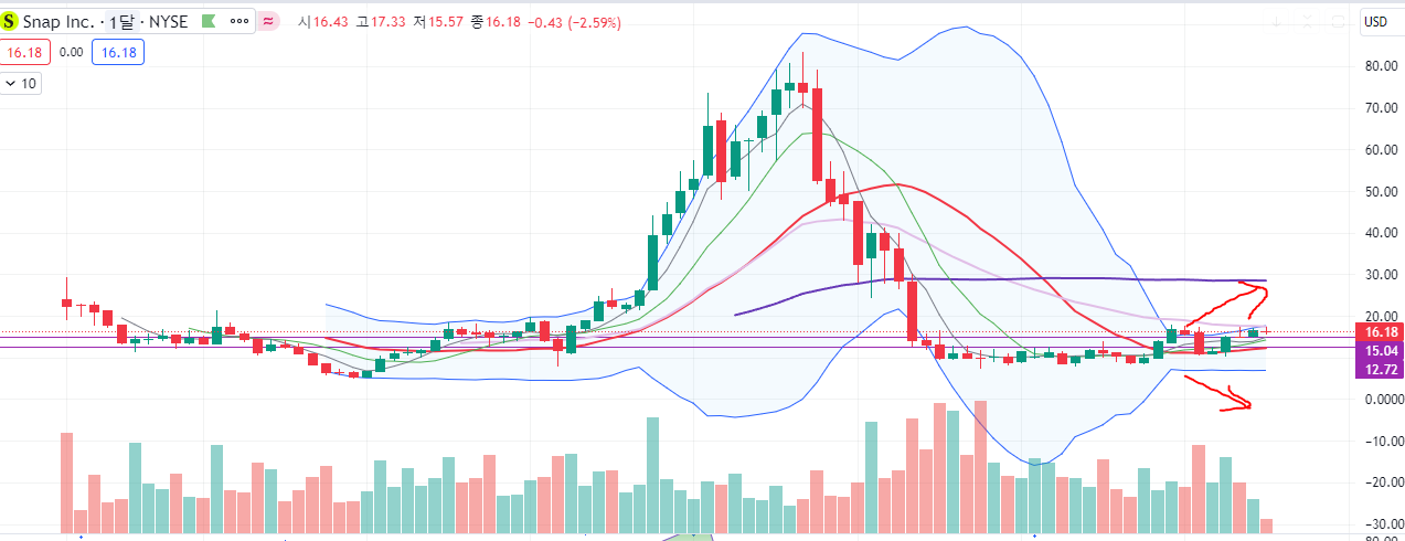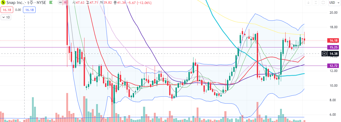 - 15$ 지지선을 기준으로 가격 잘 버텨주고 있어서, 이거 뚫으면 당분간 매물대가 없어 충분한 상승여력 있다고 보고 진입함. (비슷한 케이스: 핀터레스트)